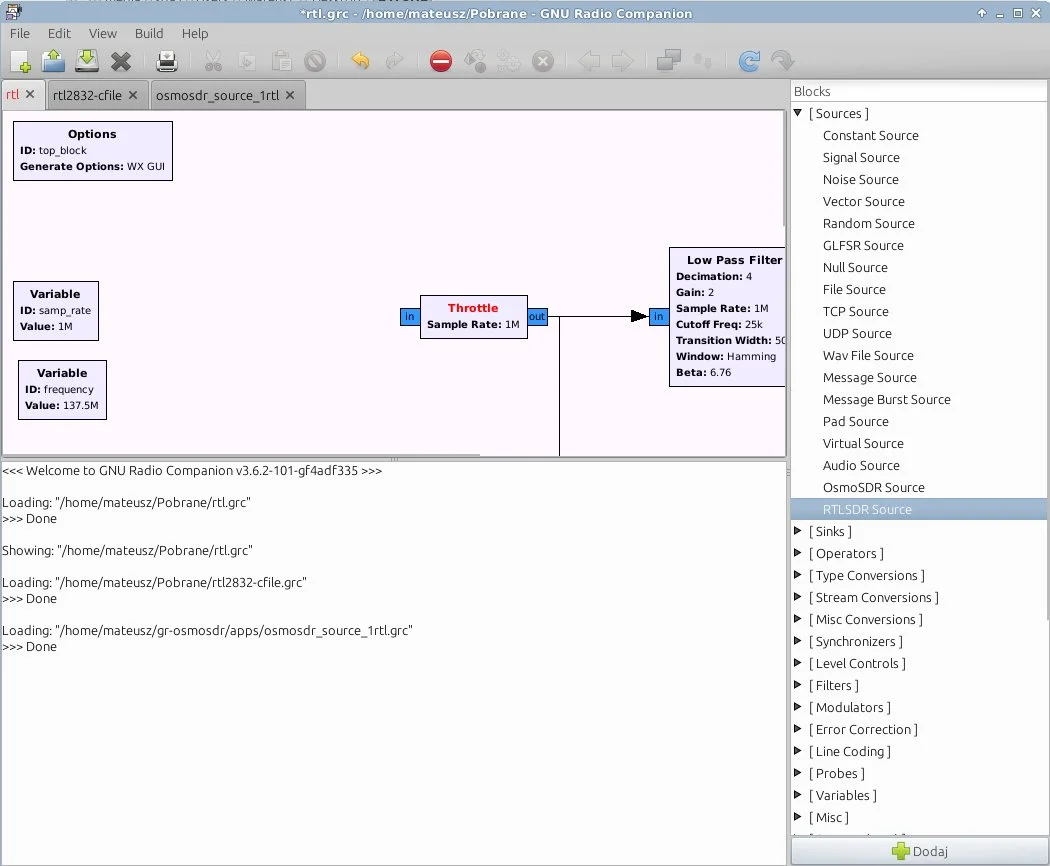 Na dobrą sprawę już same gołe GNU-radio wystarcza do tego, aby używać SDR-a. Jednak ten program nie posiada wskaźnika wodospadowego, tylko FFT (dla niekumatych - widmo sygnału), przez co korzystanie z niego jest dość problematyczne. Po uruchomieniu dodajemy plik (blok) w którym mamy zadeklarowane urządzenia, filtry i inne składowe. Poniżej znajduje się plik z rozszerzeniem .grc