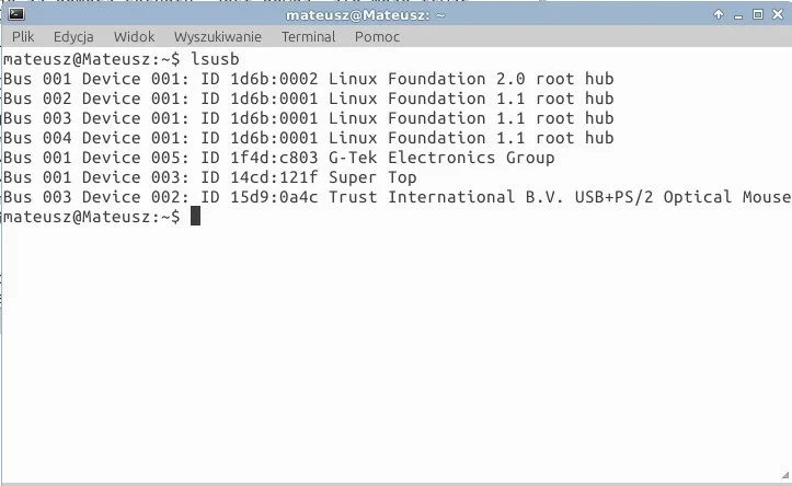 lsusb. Powinny pokazać się podłączone urządzenia USB.