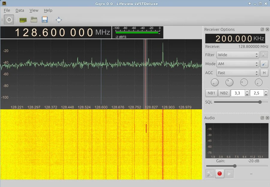 Na przykład częstotliwości lotnicze. Ta opcja jest dobra dla początkujących nasłuchowców. Częstotliwości lotnicze mieszczą się w zakresie od 118 MHz do 135 MHz z modulacją AM. Sygnał nie jest nadawany ciągle. Przykładowo - jestem w Warszawie i chcę posłuchać EPWA APP (Warszawa Zbliżanie), które jest nadawane na 128.800 MHz. Ustawiam częstotliwość LO na 128.600 MHz, następnie ustawiam odbiór na 128.800 MHz. Powiększam fragment pasma, które mnie interesuje. Czekam cierpliwie na nadanie sygnału. Po nadaniu widzę na wskaźniku wodospadowym, że został nadany. Dostrajam następnie dokładnie częstotliwość odbioru i szerokość pasma.. Po lewej stronie znajduje się wskaźnik Squelch. Odcina on program od karty dźwiękowej, o ile program nie odbiera sygnału o określonej mocy. W taki sposób nie trzeba słuchać szumów.