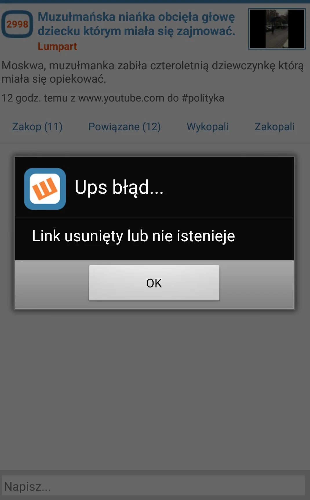 Znalezisko, dotyczące kobiety która obciela głowę dziecku, podpaliła zwłoki, a następnie krzyczała że "bóg jest wielki", mające 3tys wykopów zostało usunięte