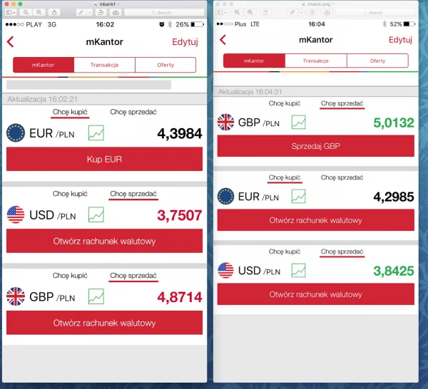Jak mBank oszukuje swoich klientów na wymianie walut !!! Ponizej zamieszczam dwa screeny w mKantoru - seriwisu mBanku do wymiany walut. 1) obrazek po lewej to kurs w mKantor na którym jest odpalony kredyt mieszkaniowy w eur - kurs zakupu euro 4,3984 2) po prawej ten sam mKantor w mBanku ale dla...
