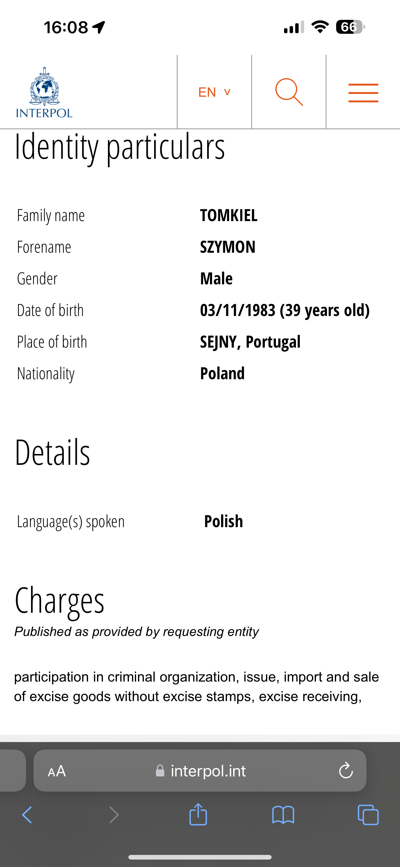 View and search public Red Notices for wanted persons Family name MAJTCZAK Forename SEBASTIAN WALDEMAR Gender Male Date of birth 31/05/1991 (32 years old) Place of birth BONN, Germany Nationality Poland