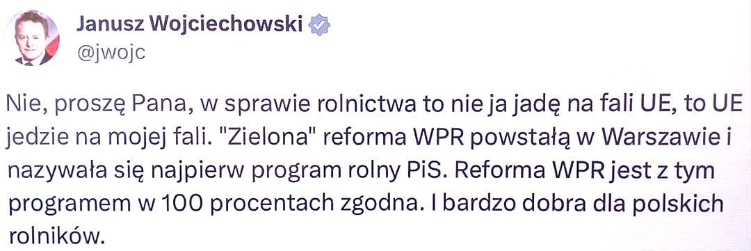 Janusz Wojciechowski (PiS) komisarz UE ds. rolnictwa "Unia Europejska jedzie na mojej fali. Zielona reforma wspólnej polityki rolnej powstała w Warszawie i nazywała się najpierw programem rolnym PiS. Reforma WPR jest z tym programem w 100 procentach zgodna i bardzo dobra dla polskich rolników"