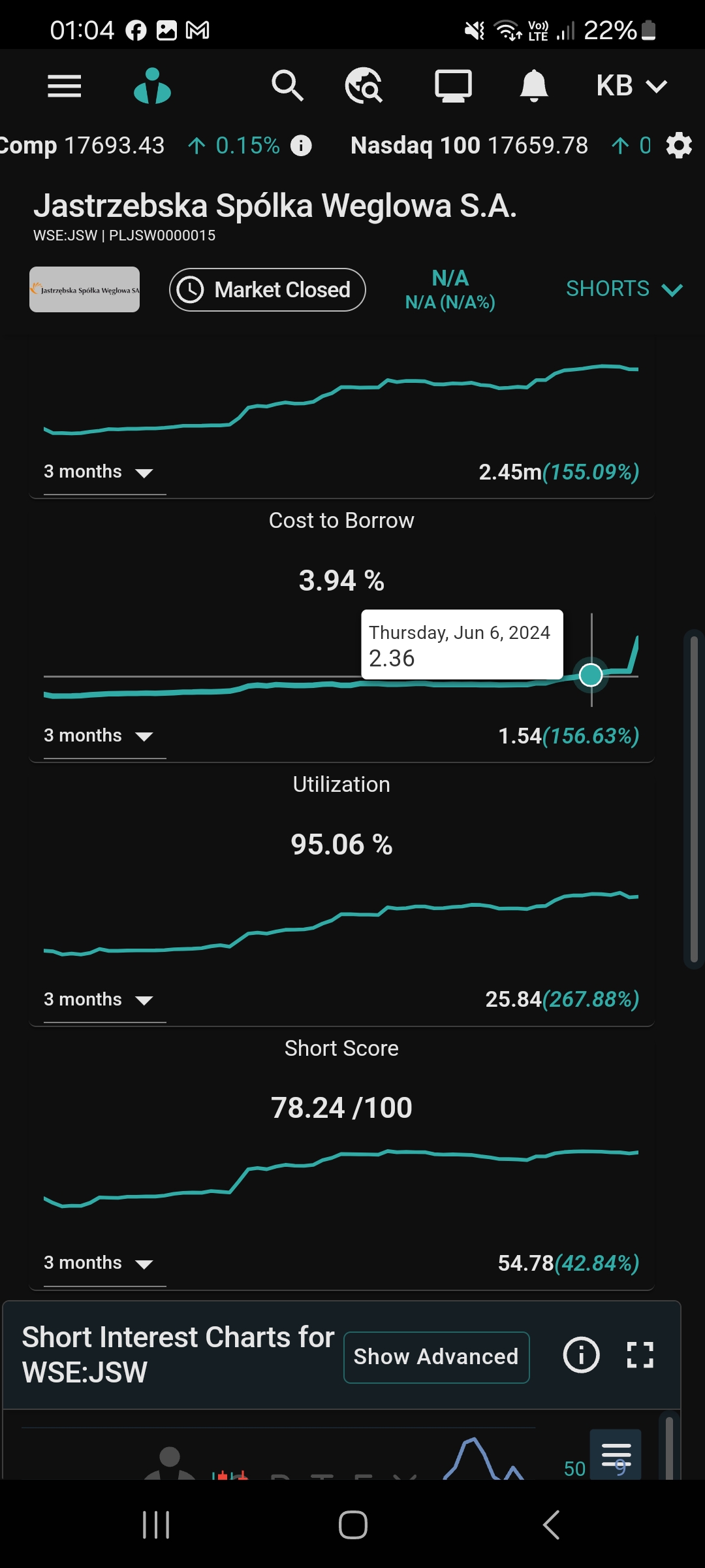 Aktualnie na JSW shorty pożyczyły 100% akcji. ( screen pochodzi z bardzo drogiego systemu ortex.com , przeznaczonego dla zawodowych inwestorów, traderów i niestety w pełnej wersji premium bardzo drogiego. Napisz PW to sprawdzę twoja spółkę za darmo w tym systemie )