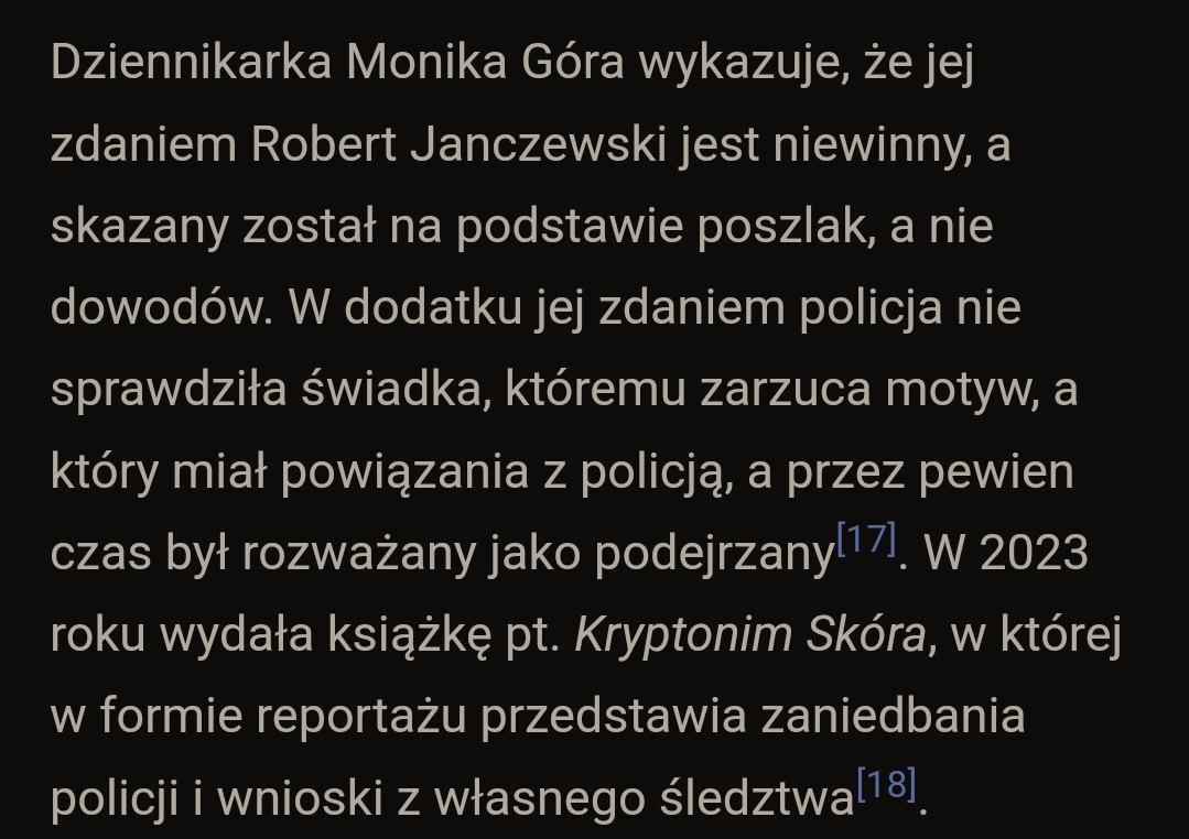 Pobierz@WuGie: Sorry, dziennikarzom śledczym też w 100% bym nie ufał. Już mi się zdarzało czytać świetne reportaże, wszystko układa się w sensowną całość, inną niż dotychczasowa, inną niż oficjalnie mówi policja. Dziennikarz/e dostawał za nie nagrody, wydał książkę, sława i pieniądze, a później czytam komentarze i posty rozrzucone po sieci i coś mu się zapomniało wspomnieć o pewnych szczegółach psujących jego narrację. Choćby