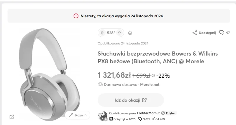 Promocja o zawrotne 22%, słuchawki były dostępne na amazonie w cenie 1517PLN, co sprawia, że cena na morele.net była tylko o 13% lepsza niż o konkurencji.