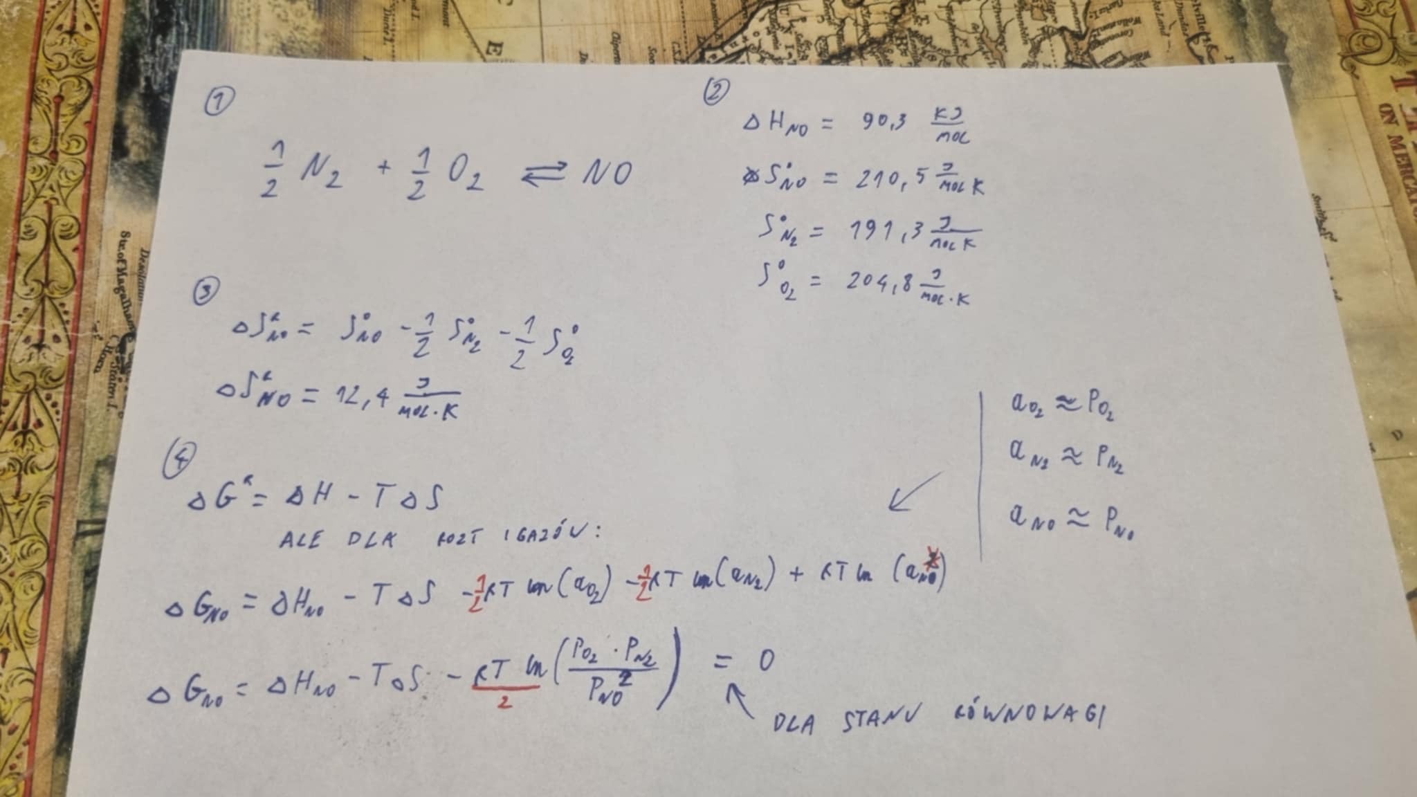 4) Wyrażenie na entalpię swobodną z uwzględnieniem stężeń/ciśnień produktów. (Jak widać, bez tego efektu reakcja w ogóle by nie zaszła). Przyjąłem założenie, że współczynniki aktywności są równe 1 (nie są, ale to tylko by zmniejszyło ilość produkowanego NO).