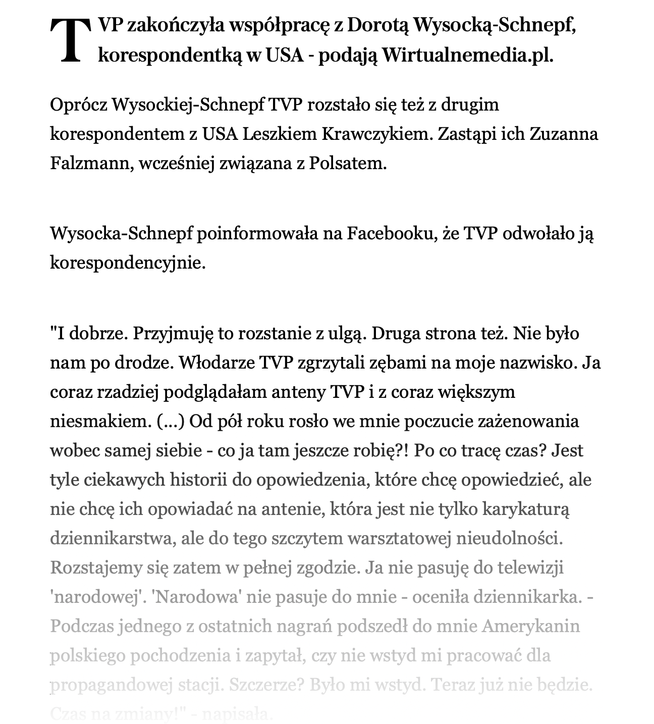 Natomiast zgadzam się, że jej kariera wisi na włosku. Wystarczyłoby zrobić Wykop efekt dla akcji likwidacji mediów publicznych, używając jej i jej teścia, jako przykładu oderwania się tej instytucji od rzeczywistości. Jej włodarze momentalnie by ją wyrzucili byle zamieść akcje pod dywan.