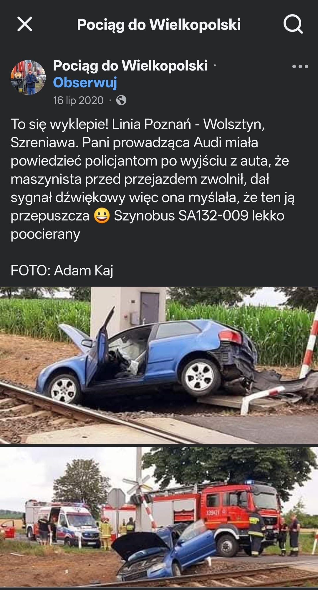 W czwartek rano Szynobus Kolei Wielkopolskich relacji Poznań Wolsztyn zderzył się z samochodem osobowym na przejeździe w miejscowości Szreniawa. Za kierownicą audi siedziała kobieta., o własnych siłach wyszła ona z auta. Była zszokowana. "Myślałam że maszynista mnie przepuszcza, to wjechałam" dodała