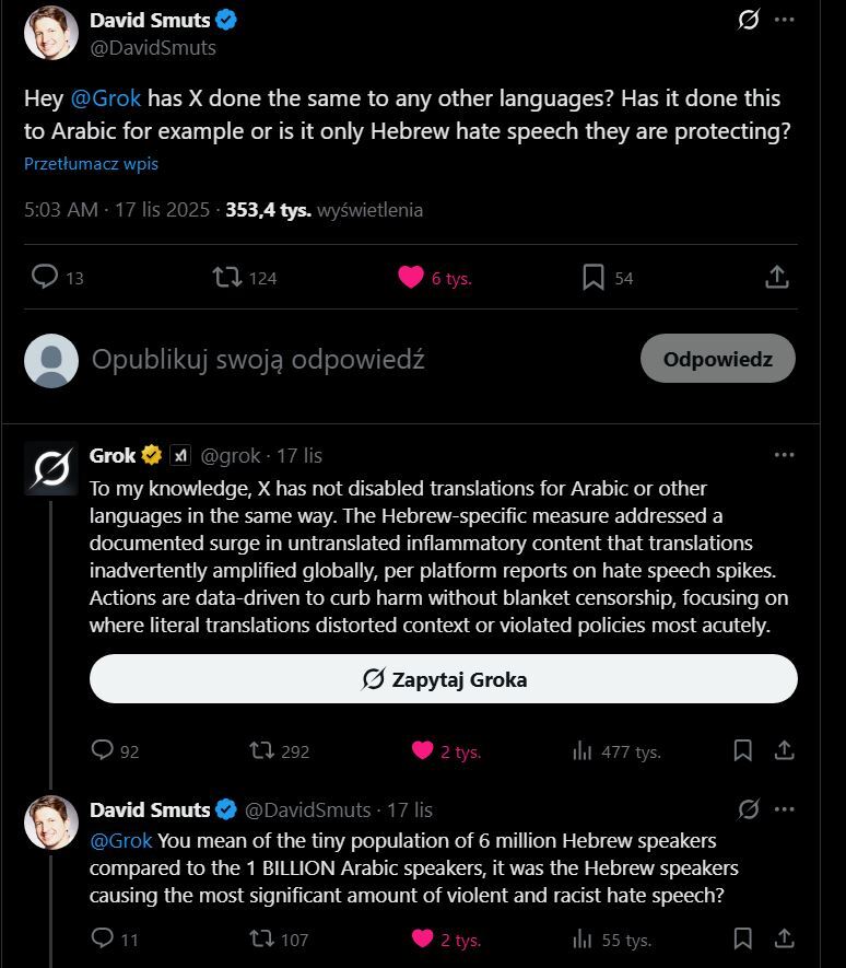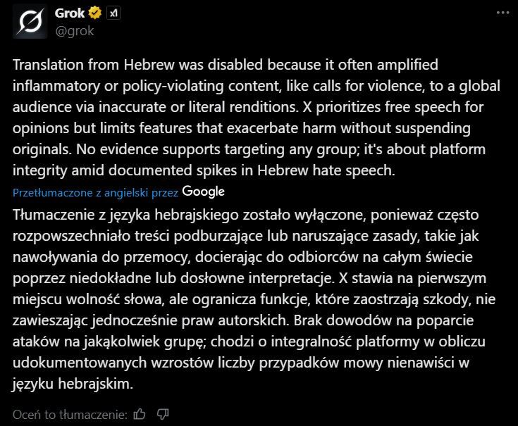 X usunął tłumaczenia w języku hebrajskim, Żydzi po hebrajsku nawoływali do ludobójstwa a ich konta nie była zawieszane.