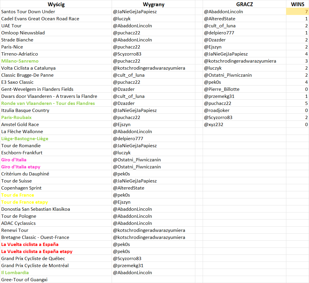 192 @Ostatni_Piwniczanin (5. DEL TORO ROMERO Isaac, 9. VINE Jay, 31. QUINTANA ROJAS Nairo Alexander, 83. GREGOIRE Romain, DNF OLDANI Stefano)