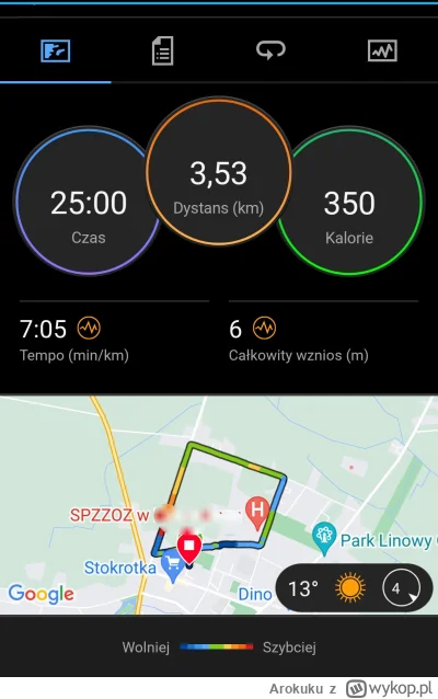 Dzis krótszy czas treningu wiec postanowiłem go przebiec szybciej niż zwykle bo trzeba gonić kolegów z tagu. Chciałem biec tempem okolo 6,00 no i finalnie po 2 km spuchłem XD Myslalem ze nie dam juz rady dokończyć treningu ale jakoś sie doczłapałem. Chyba jestem zbyt ulany na wyższe tempo no ale zobaczymy za jakiś czas.