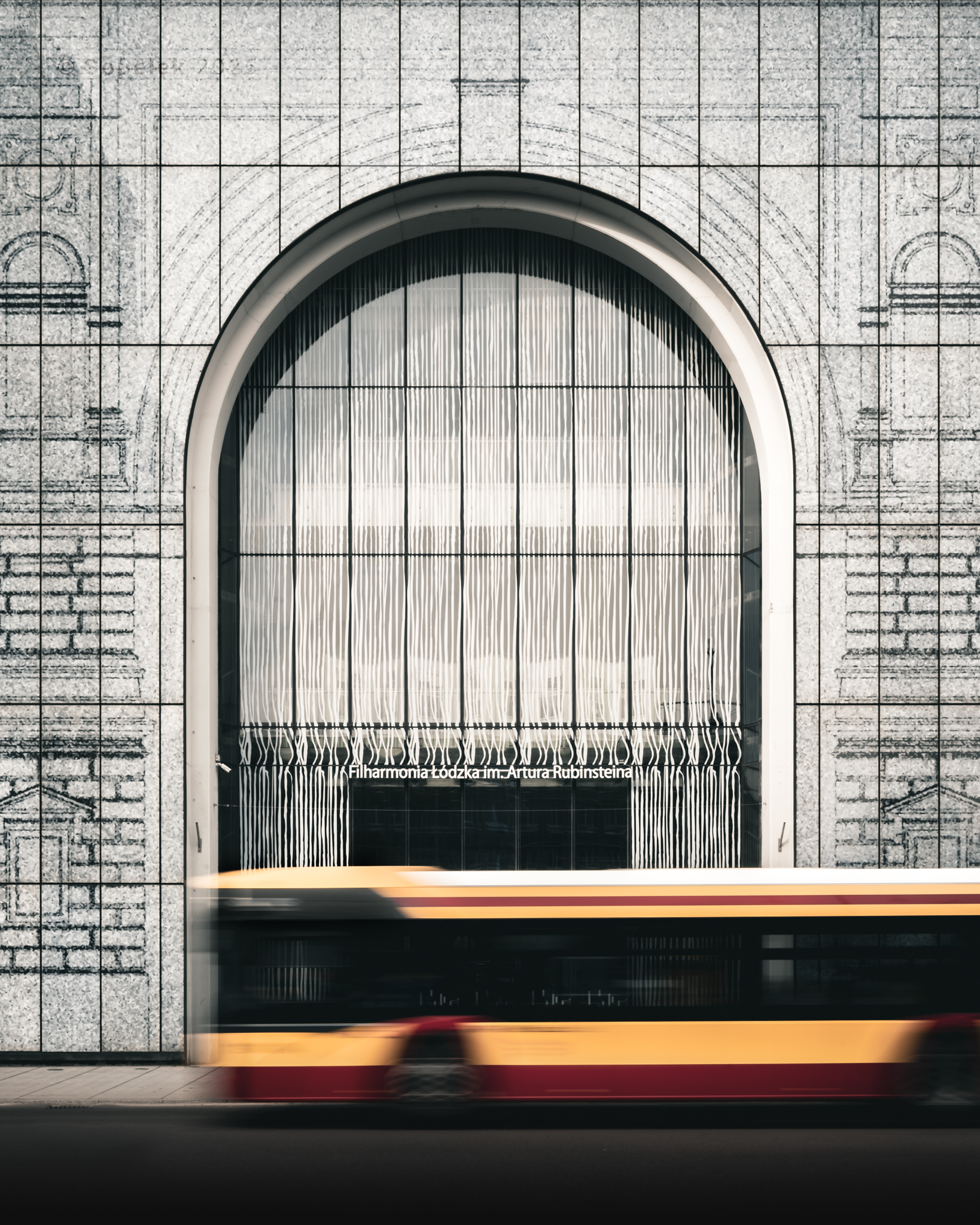 Moje spojrzenie na Filharmonie Łódzką. Fasada pokryta jest teksturą nawiązującą do wcześniejszego budynku, który tu stał. W latach 90 został zamknięty z powodu złego stanu technicznego, a do momentu otwarcia nowego pod koniec 2004 roku, przeniesiono się na Piotrkowską 243.