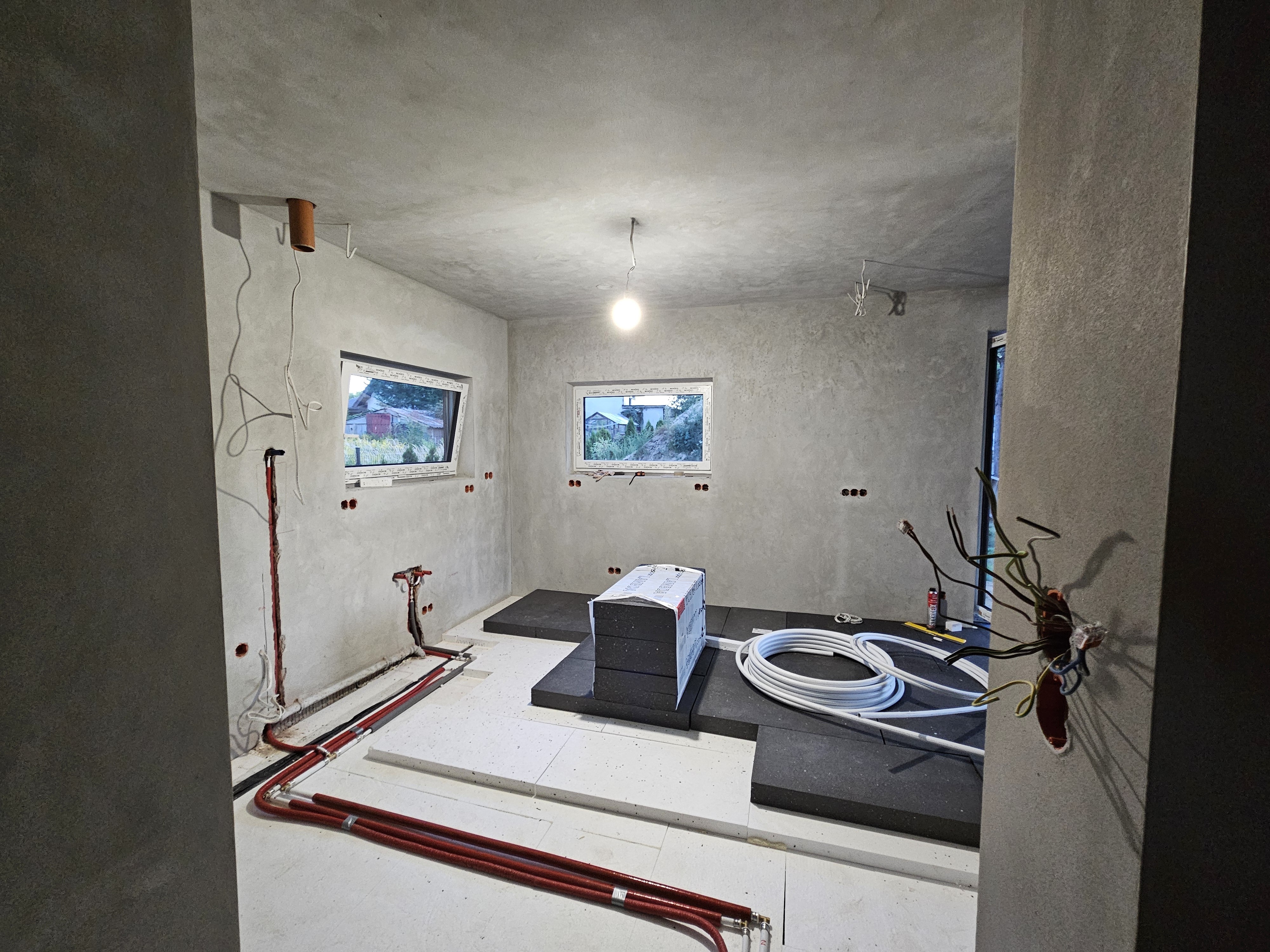 Rozkładanie styropianu. 3 warstwy, pierwsza 4cm żeby wyrównać koryta kablowe i wodę ogrodowa. Potem 6cm i tam szła woda użytkowa i cyrkulacja, potem 10cm i tam szły rury od kominka z płaszczem ( nie będzie instalowany ale instalacja wykonana) oraz zasilanie do podlogówki.