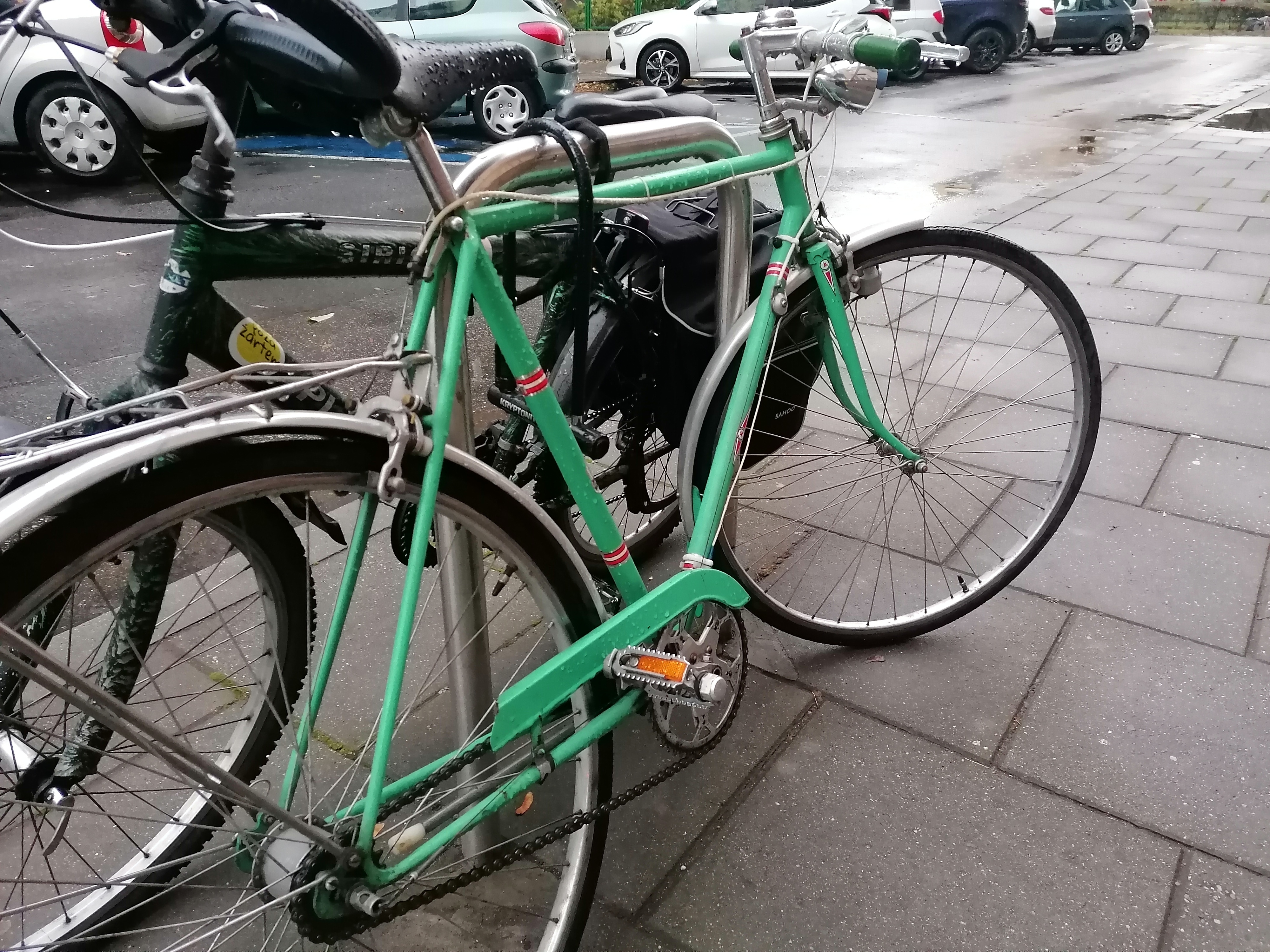 Fajny rowerek dzisiaj spotkałem w Krakowie. Kolor jest genialny, ale na ramię widać kropki rdzy która przebija się przez lakier. Fajny Z tyłu mój bolid (。◕‿‿◕。) Wołam @4x80 bo pisząc wpis o tobie pomyślałem, bo chyba jak kojarzę lubisz takie klasyki rowerowe, jak nie to przepraszam #rower