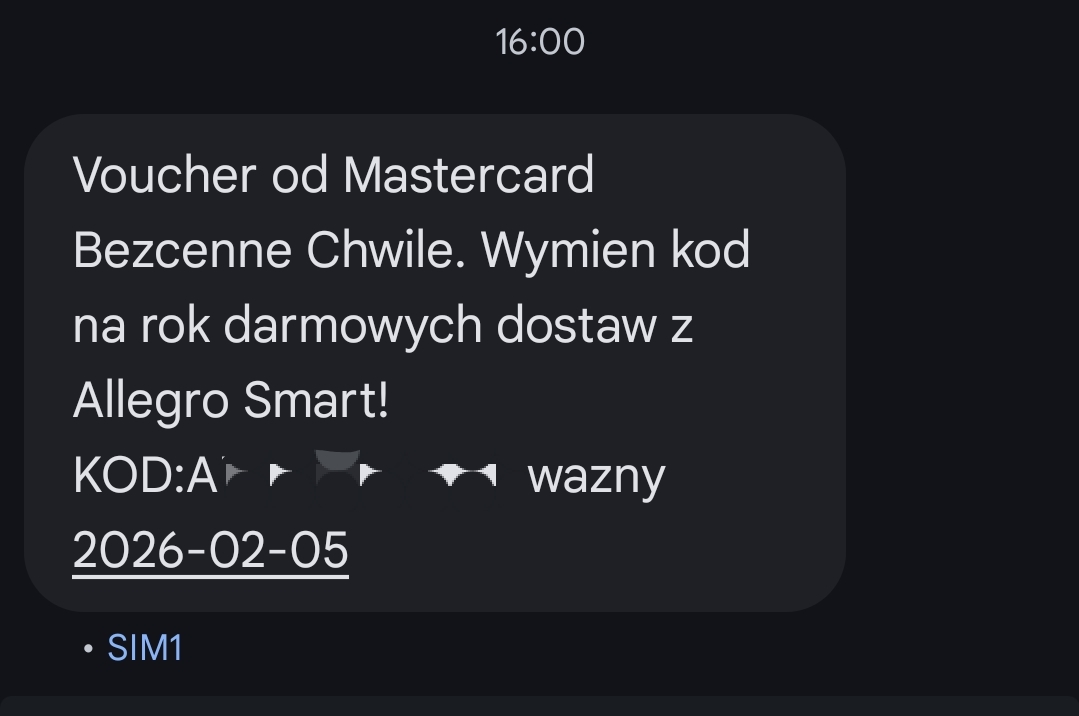 @Maaako źle zrozumiałeś treść SMS-a. Kod jest na rok darmowych dostaw Allegro Smart. Należy go natomiast wykorzystać do 5 lutego.