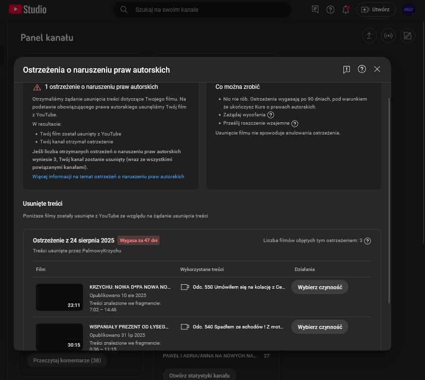 @dizel81: Dostałem tylko tego maila, nic więcej nie wiem. Nie idzie zalogować się na YouTube Studio z konta KamboShotów. Chyba nie było więcej zgłoszeń, tylko jak przypuszczam YouTube po kilku dniach uznał te za wystarczające do usunięcia kanału. Jak Krzychu nie wycofa zgłoszeń to kanał nie wróci. Jedyne co to możecie mu w komentarzach zadawać pytania o KamboShoty, bo na maile jak widać nie odpowiada.