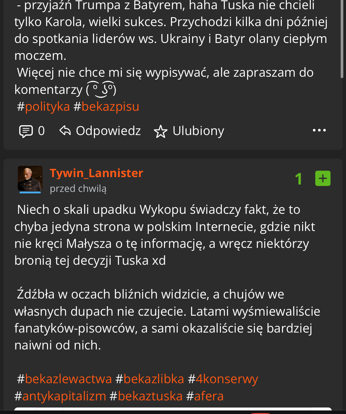 Źdźbła w oczach bliźnich widzicie, a chujów we własnych dupach nie czujecie. Latami wyśmiewaliście fanatyków-pisowców, a sami okazaliście się bardziej naiwni od nich.