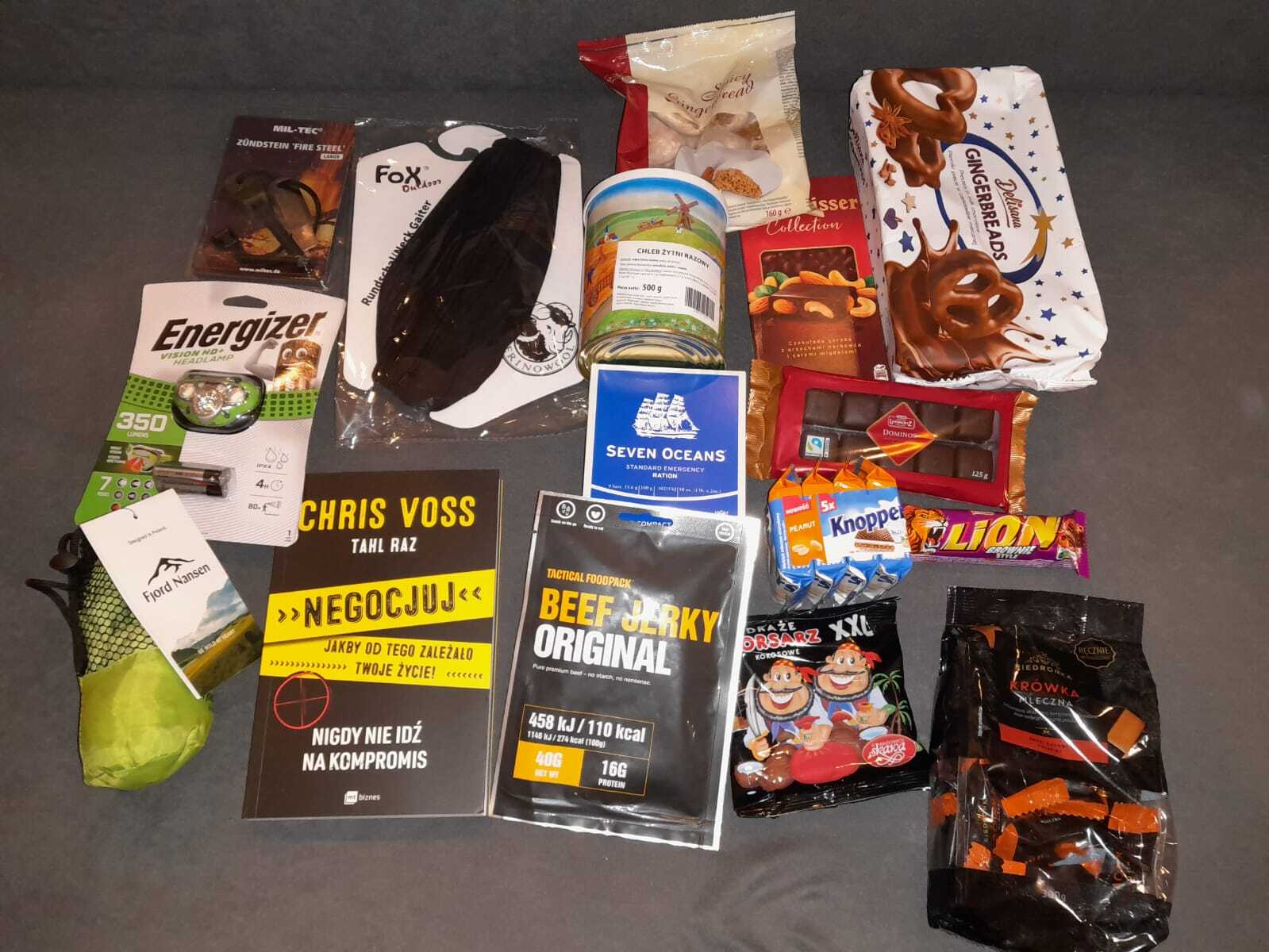 W środku kubek i skarpetki z motywem gór, regionalne piwka na świąteczny wieczór, długopis by napisać kolejny list do #wykopaka słodycze, świetna kartka 3d która wyląduje pod choinką oraz odręcznie pisany list!