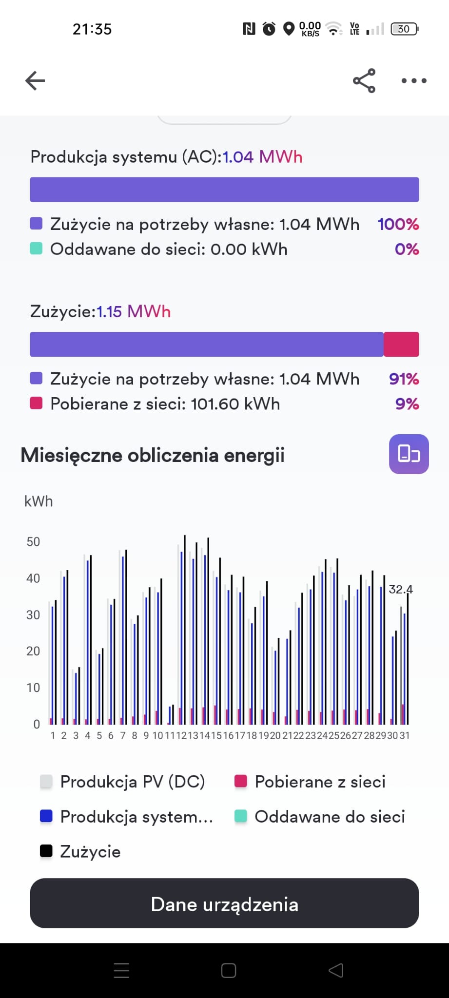 #fotowoltaika Potrzebuję pomocy bo chyba instalacja #oze nie działa prawidłowo. Na wykresie widać że zużycie jest zawsze bliskie produkcji przez panele. Jest to nie możliwe bo w godzinach 8-15 w domu działa tylko lodówka i może dogrzewa się cwu co jakiś czas. Magazyn energii nie ładuje się, 10% cały dzień, przed chwilą spadł na 9%