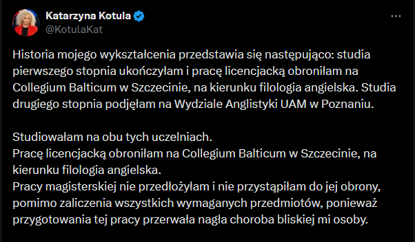@wstanczyk: Nie chciało mi się przeszukiwać innych wypowiedzi. Ale ona sama stwierdziła, że filologie angielską ukończyła na Collegium Balticum w Szczecinie. W powyższym screenie wskazuje ze zrobiła to na UAM - pierwsze kłamstwo. Druga kwestia do której się sama przyznała to ta, że nie ukończyła niczego na UAM, więc nie mogła"ukończyć" zgodnie z screenem powyżej, bo nie przedłożyła żadnej pracy. Ergo po prostu jest oszustką bo przez lata w sejmie