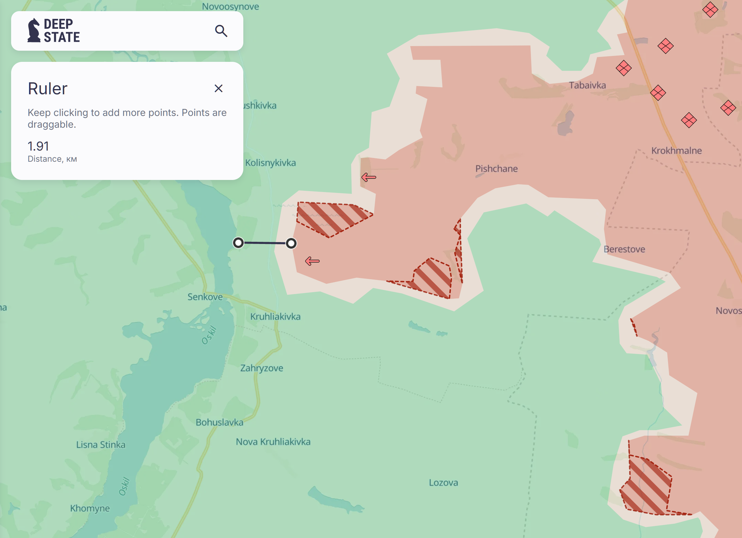 Jako że nikt jeszcze nie wrzucił - ostatnia aktualizacja map DS. Dzień wcześniej pokazali przesunięcie w kierunku rzeki (na mniej niż 2km), teraz poszerzenie wyłomu. Jako że większość ostatnich aktualizacji DS ma kilkudniowe opóźnienie to można przypuszczać że ten rzekomo odparty zmasowany rosyjski atak sprzed kilku dni jednak nie był aż taki odparty i dojście do rzeki oraz odcięcie drogi zaopatrzeniowej w Kruhliakiwce to raczej kwestia tygodnia-dwóch.