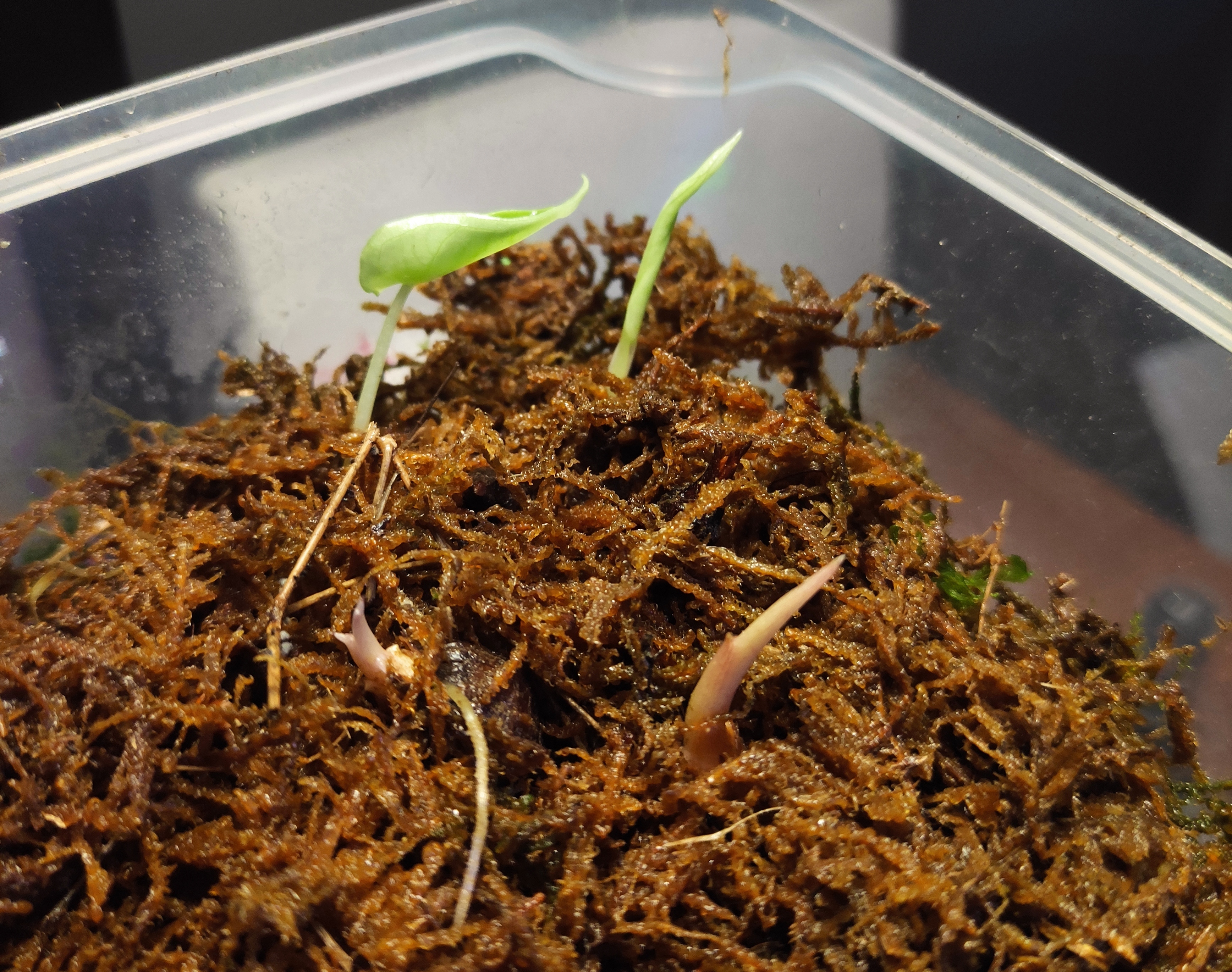 Pierwsze liście u Alokazji z bulw, chyba z pół roku siedziały w mchu. Miałem w tym pudełku bulwy dwóch odmian: Black Velvet i jeszcze jakaś, ale nie pamiętam jaka. Zobaczymy co wyrośnie XD