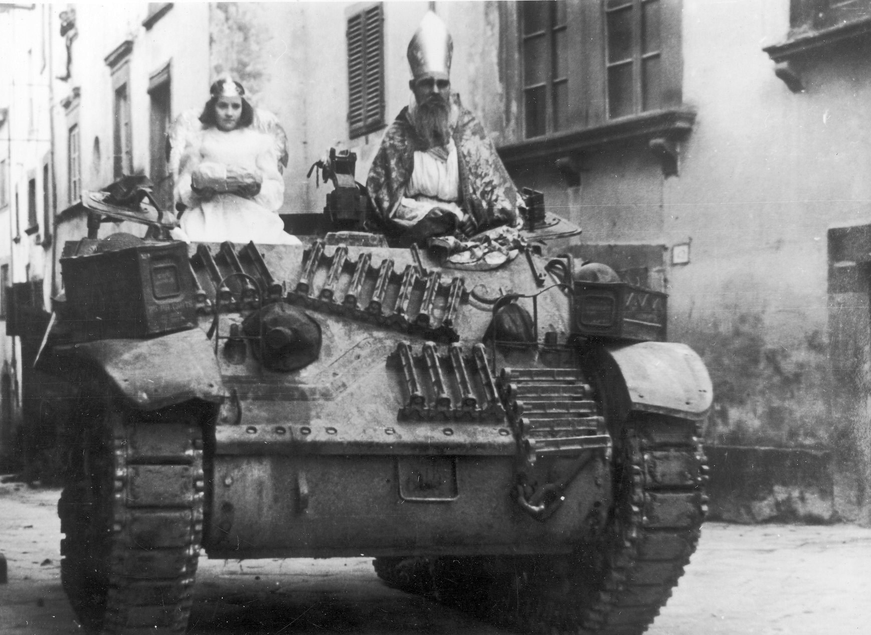 Pchor. Edward Wojczak z 6 Pułku Pancernego "Dzieci Lwowskich" jako Święty Mikołaj udaje się wraz z dziewczynką przebraną za aniołka, na czołgu M3/M5 Stuart, do dzieci w Bibbiena, 1944 r., NAC