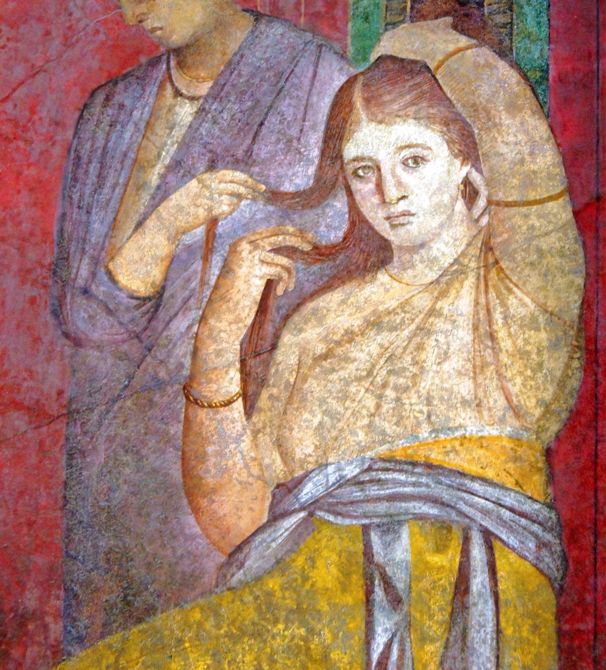 Fresk rzymski ukazujący młodą kobietę przyglądającą się oglądającemu. Obiekt datowany jest na I wiek p.n.e.; odkryty w Willi z Misteriami w Pompejach.