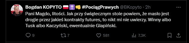@gonzo91: ona ma być prezy...dentką? :D Niech jej ktoś powie, że ta spekulacja ma swoje źródło w chorobach krów, wzrostu kosztów energii, niższej jakości mleka i przede wszystkim suszy. I niech sprawdzi jak wywaliło ceny mleka pod koniec września a tym samym teraz mamy poj3bane ceny masła w sklepach. Do tego wzmożony przedświąteczny popyt i pani może zająć się tematem o którym mało wie, ale każdy o tym mówi, więc i ona