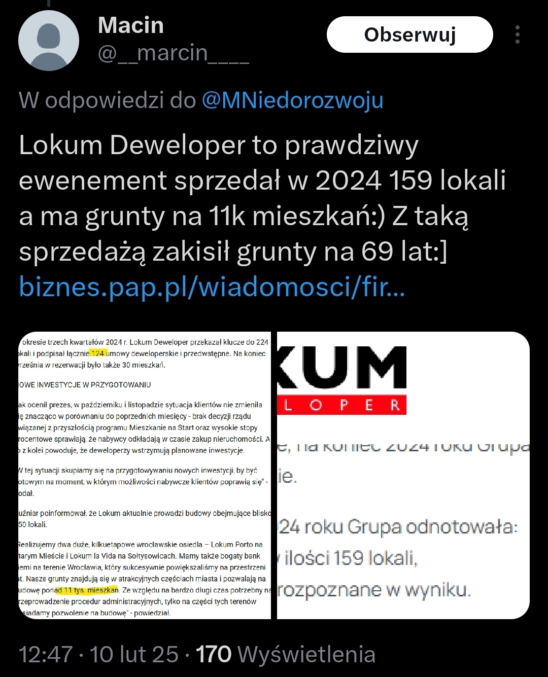 @rzzz: ale to nie tylko oni. To jest powszechna wiedza że ogromna większość deweloperów posiada gigantyczne tzw. "banki ziemi" w ilości jakiej się wam nie śniło. Najgorsze, że nie chodzi tylko o puste grunty, tylko w większości są to zabudowane obszary w dużych miastach, na których normalnie są lokale działalności gospodarczej. Masz biedronkę lub Lidla koło domu? A może piekarnię, lub pasażyk handlowy? Możliwe że od kilku lat ten grunt