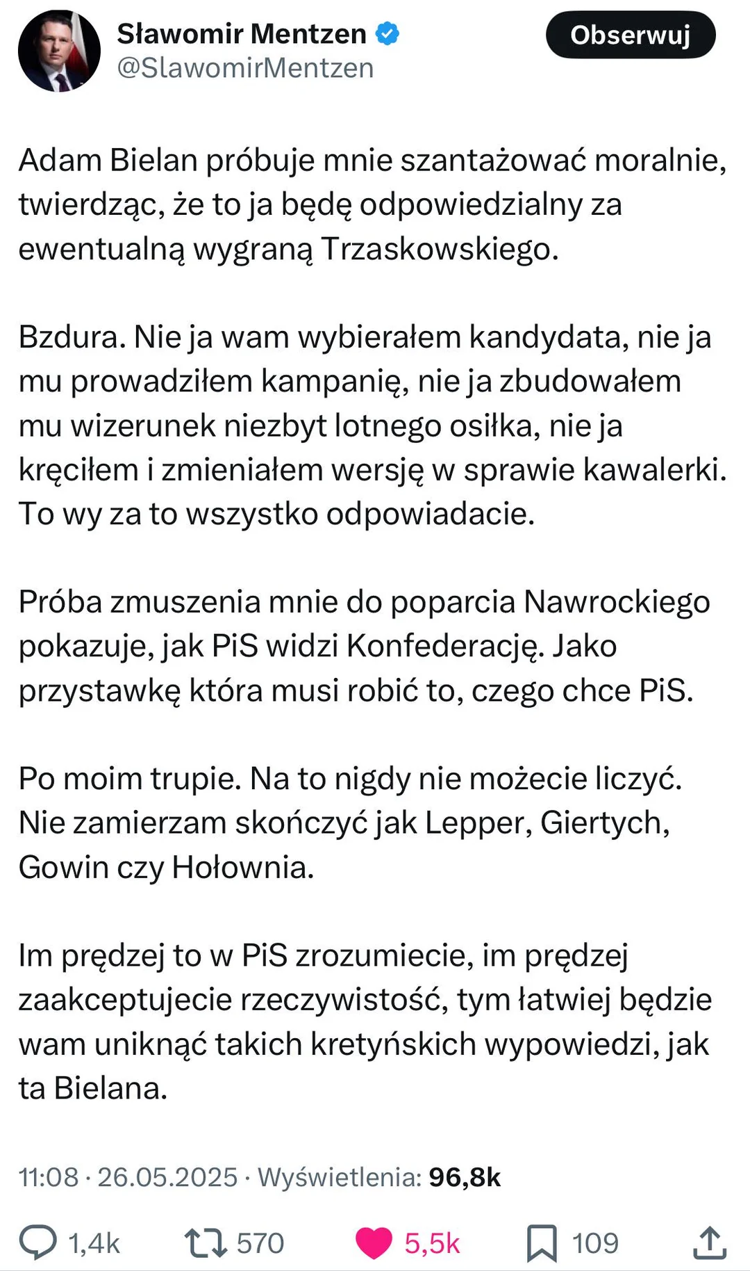@Mitur: To ty nie rozumiesz. Nie chodzi o to kto ile czyich poglądów popiera. Chodzi o to, że a) mentzne rozumie, że ktoś tak jak batyr nie może zostać prezydentem RP i b) przegrana pisu jest menetzenowi na rękę, bo osłabi na prawicy ich, a wzmocni jego