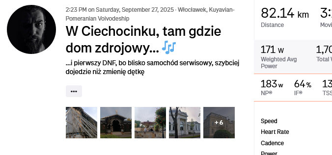 Wrześniowa stówka zaliczona i wychodzi na to że to mój trzeci najlepszy czas na 100 km, mimo że wpadła kolejna dłuższa przerwa przez niepogodę i brak czasu. Wziąłem ze sobą kumpla, bo kupił nowy rower i chciał go przetestować. Jest szybszy od poprzedniego i teraz przynajmniej za mną nadąża (⌐͡■͜ʖ͡■) ale na przodzie za bardzo nie chciał jechać, więc sam ciągnąłem.