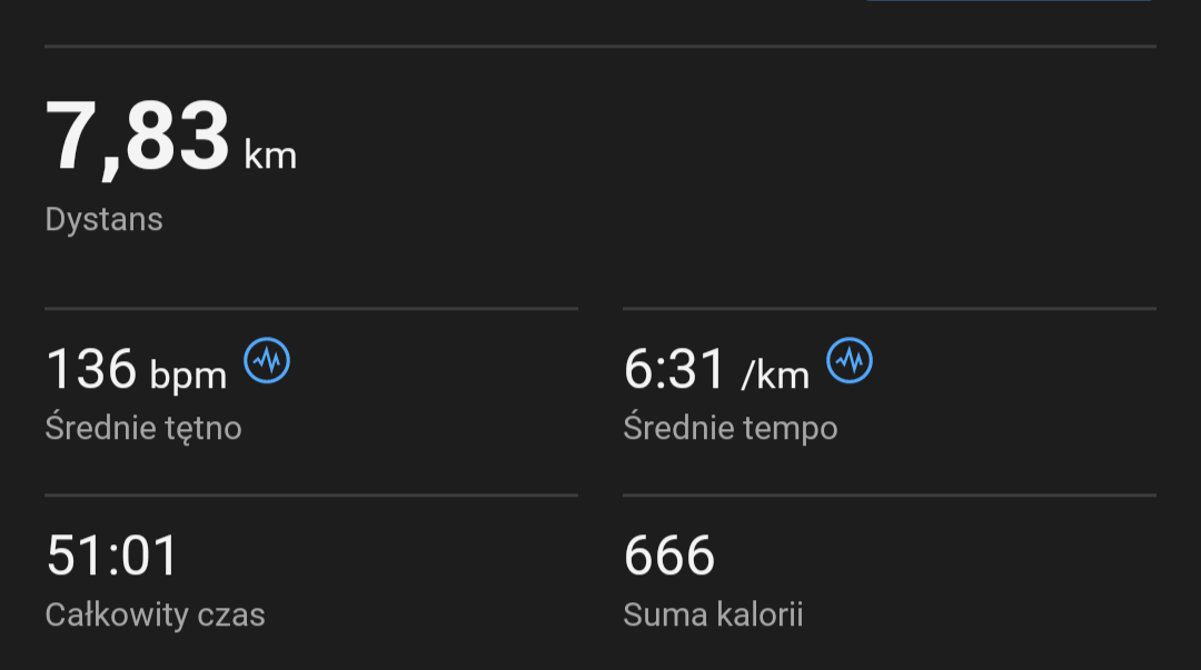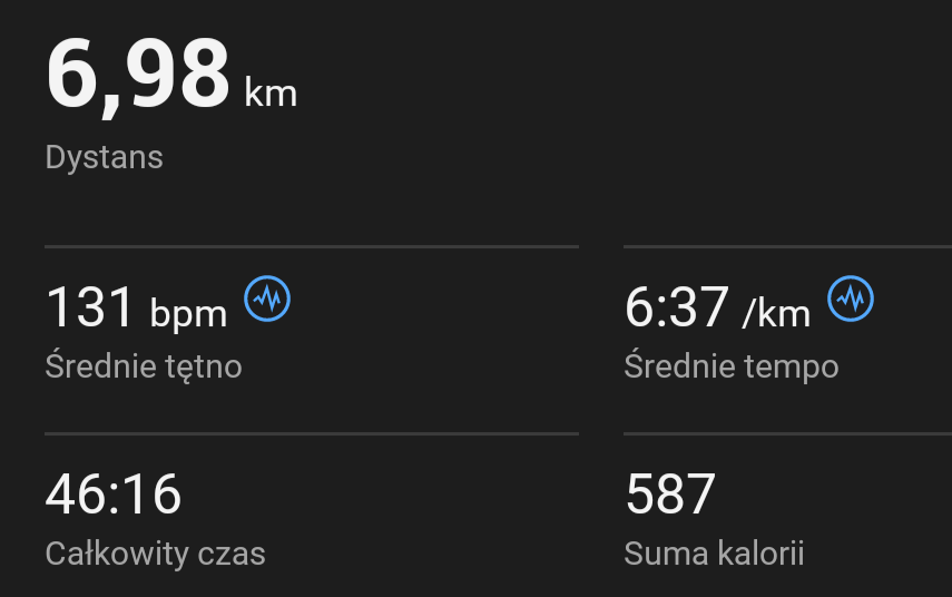 8.6km - nie dałem rady przebiec 10 km w tempie wolniejszym niż półmaraton niecały miesiąc temu po tym przeziębieniu, serio, nie wiedziałem, że to aż takie spustoszenie potrafi w organizmie wywołać. Tętno przy tempie 3:55/4:05 podskakiwało do 193 nawet, gdzie normalnie mam 179-183 i faktycznie przytykało niesamowicie.