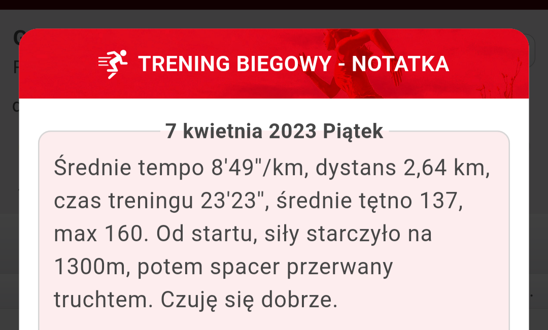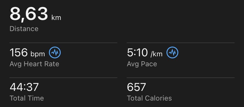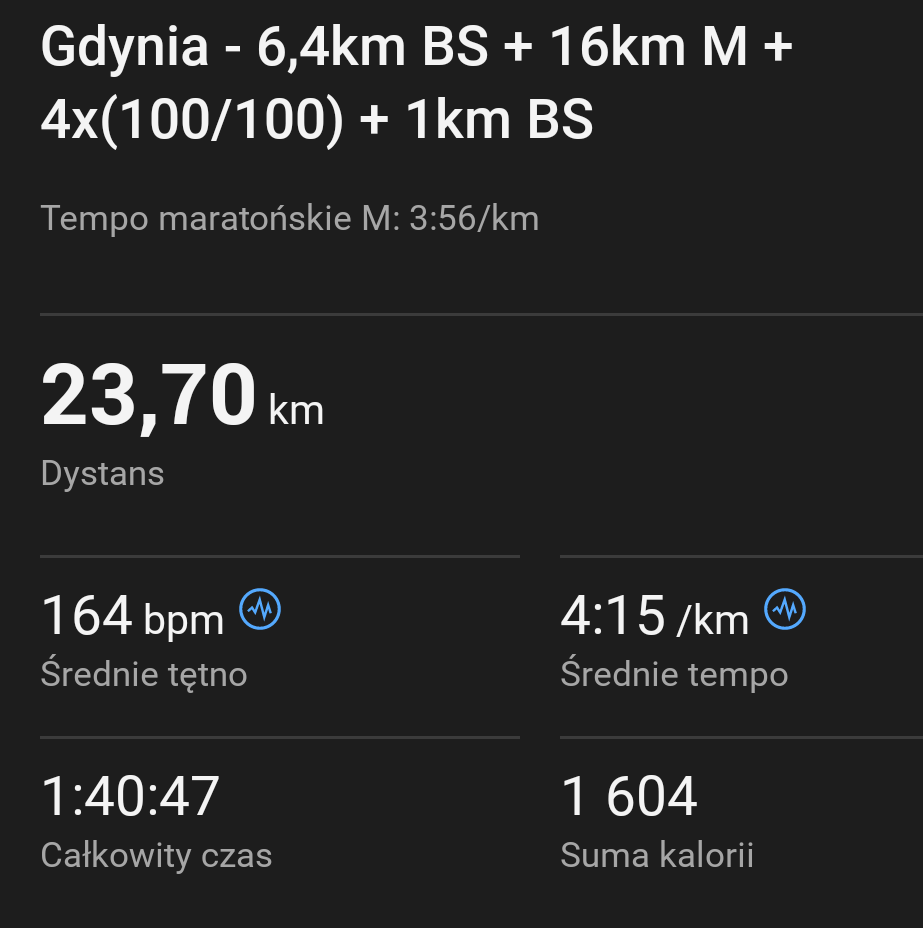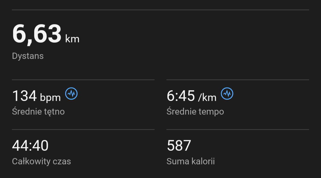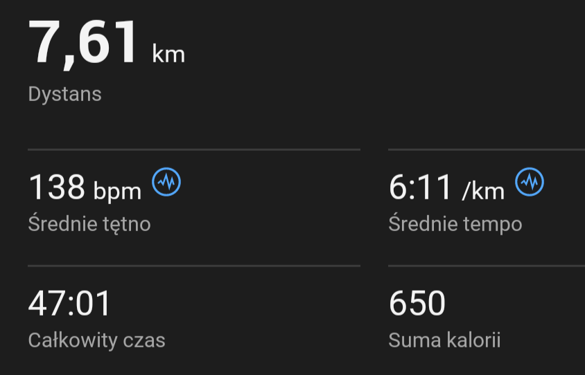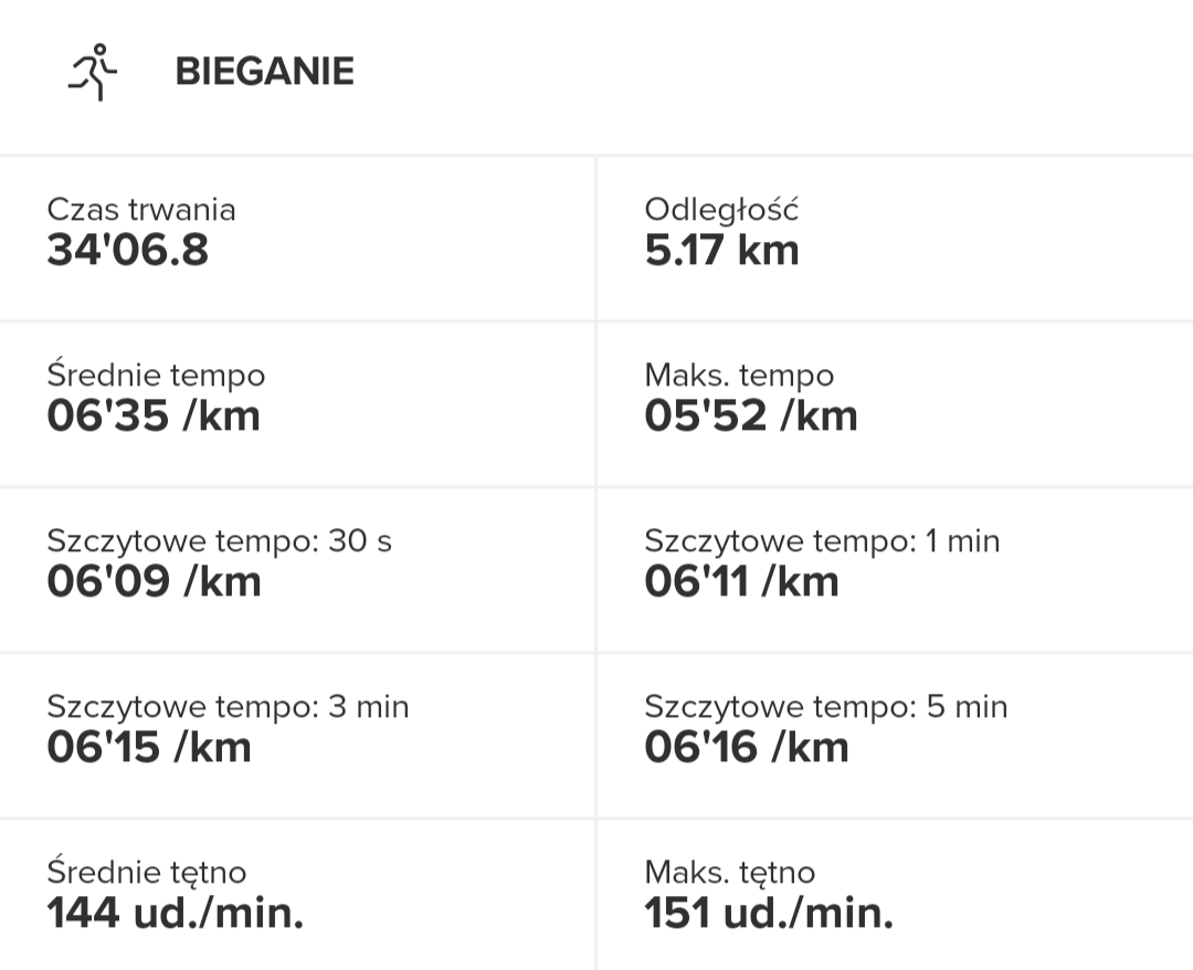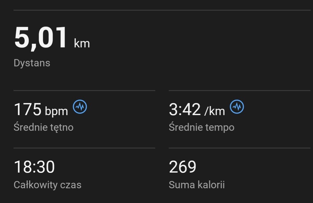 Dziś trening progowy, 10 min rozgrzewki w tempie 6:15, 15 minut biegu w tempie 5:05 (musiałem zrobić przerwę w połowie, bo bym zwymiotował, ale i tak jest progres xD) i druga runda 10 min w tempie 6:15.