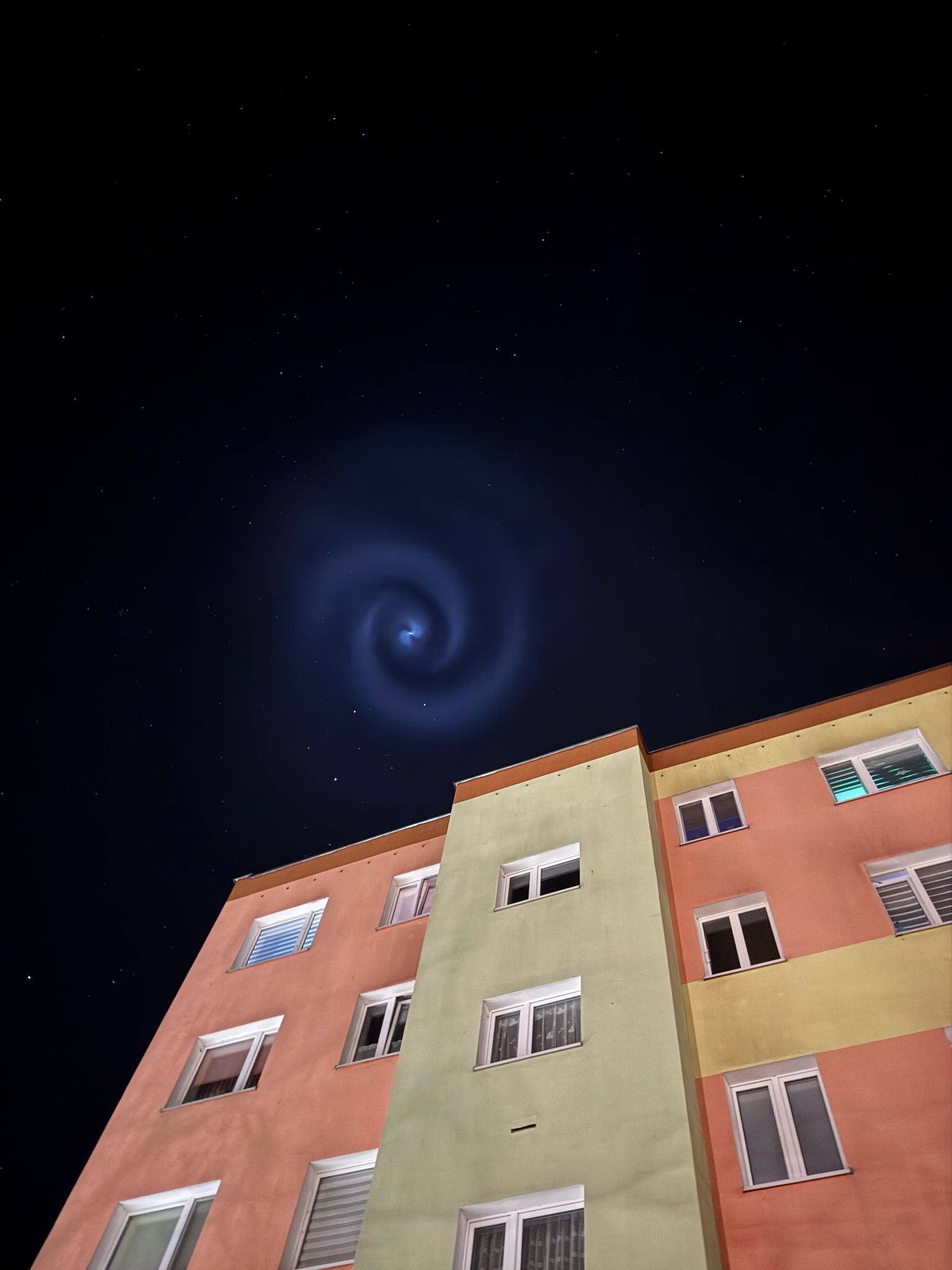 Zdjęcie z godziny 21:03. Lokalizacja Wąbrzeźno, kujawsko-pomorskie. Wracałem z psem do domu i zobaczyłem to nad blokiem. Zaniosłem go i wróciłem po minucie po więcej zdjęć z dłuższym czasem naświetlania ale już nigdzie tego na niebie nie było. To było piękne... Co to jest?