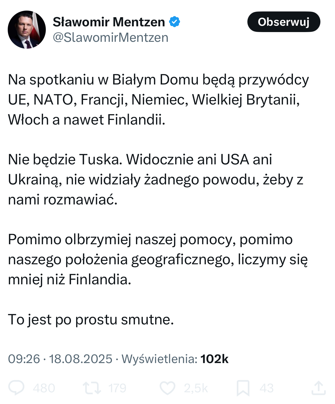 Co za nieprawdopodobny bakłażan z tego Mentzena. Dzięki jego poparciu wybrano Nawrockiego na prezydenta. Teraz wini Tuska o to, że go nie będzie w USA. Jeszcze tydzień temu z kolei tłumaczono nam, że Trumpa na siebie bierze Nawrocki, który dosłownie wywalczył sobie zamiast Tuska udział w telekonferencji z Trumpem i przedstawicielami krajów UE. To jest jakaś schizofrenia? Gigantyczna kompromitacja Konfederosji i Nawrockiego.