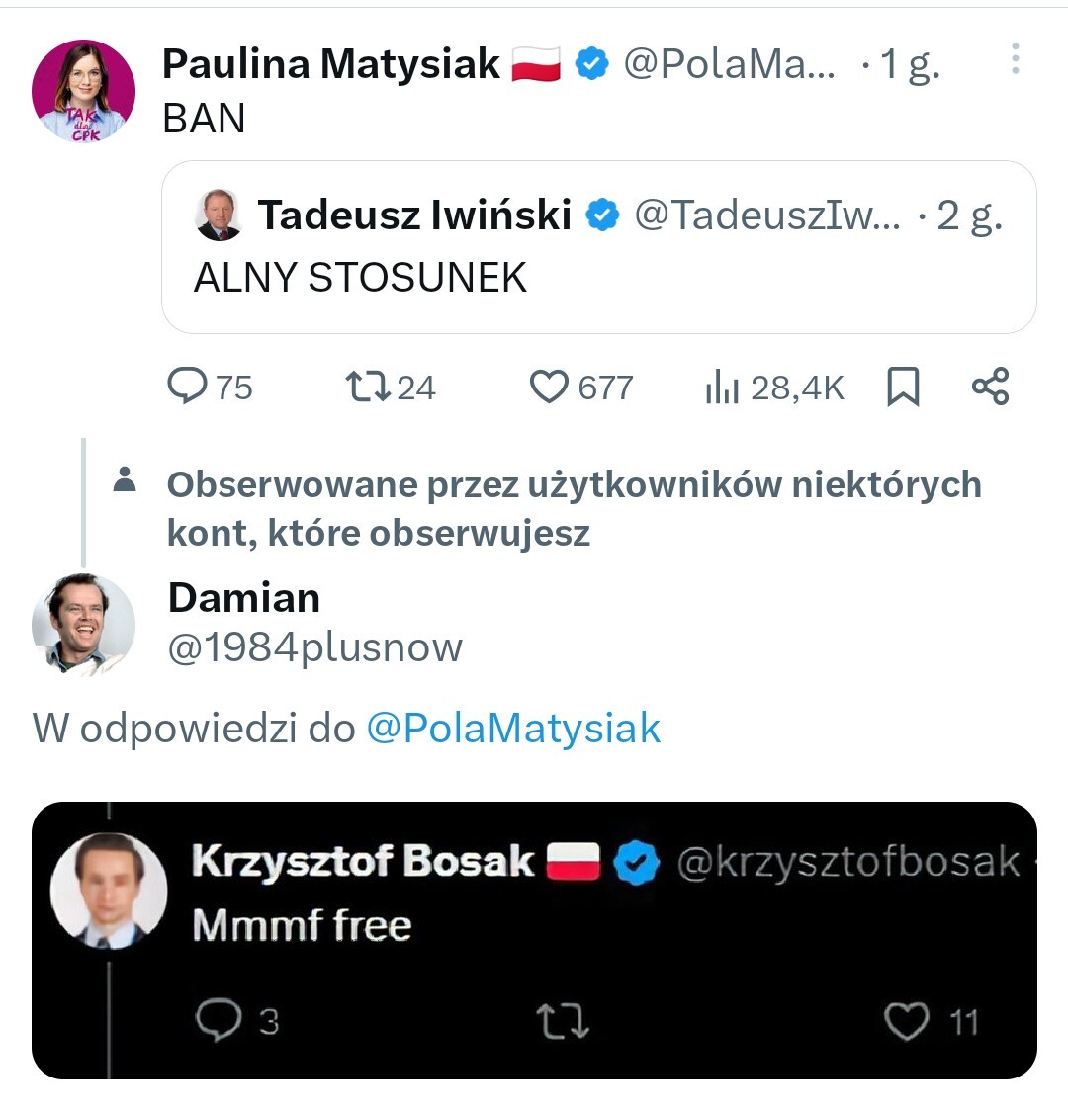 @OpowiedzMiCos: Lewica nie jest za bezwzględną wolnością słowa. Lewica wie, że istnieje coś takiego jak dezinformacja, sianie fejków i wojna hybrydowa. Lewica wie, że temat jest skomplikowany i trudno walczyć z dezinformacją i jednocześnie zachować wolność wypowiedzi. Prawica jest za bezwzględną wolnością słowa (chyba że chodzi o boga, albo inne prawackie świętości), a sama usuwa posty, gdzie