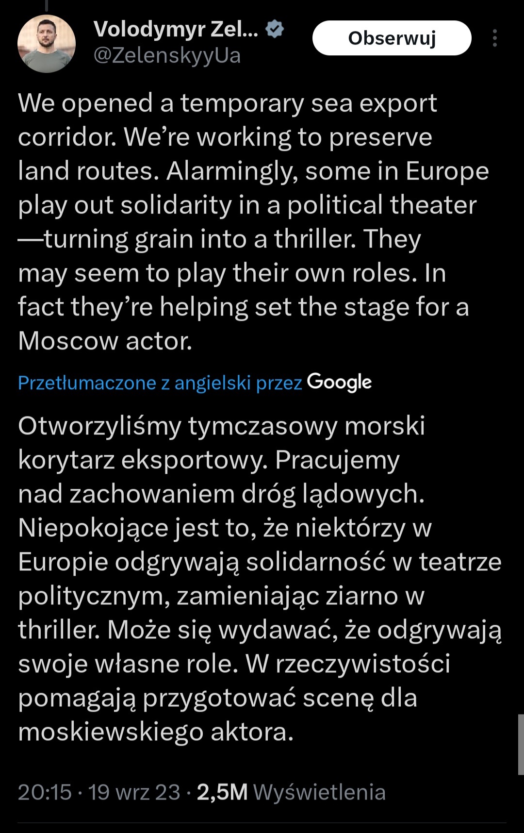 Rząd nie odpowiedział odpowiednio na działania Ukrainy w szkalowaniu dobrego imienia Polski. Czego efektem jest ostatnia wypowiedź Zełeńskigo na forum międzynarodowym. I dziwić się temu skoro Polska dyplomacja nie potrafiła w poniedziałek ostro i stanowczo zareagować? Czaicie, że na wypowiedź prezydenta Ukrainy z 2.5 milionami wyświetleń, Polska odpowiada na iksie słowami byłej premier która ma 110 tysięcy wyświetleń?To jakby na pojedynek o złotą piłkę z Messim, wysłać jakiegoś randoma z Radomiaka a