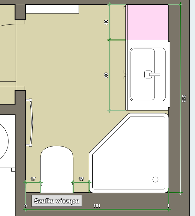 Jej wymiary w stanie deweloperskim to 2,33m x 1,62m. Na rysunku to 2,13m x 1,61m z uwagi że na ścianie z toaletą zakładam 20cm na montaż stelaża. Prysznic to 90x90.