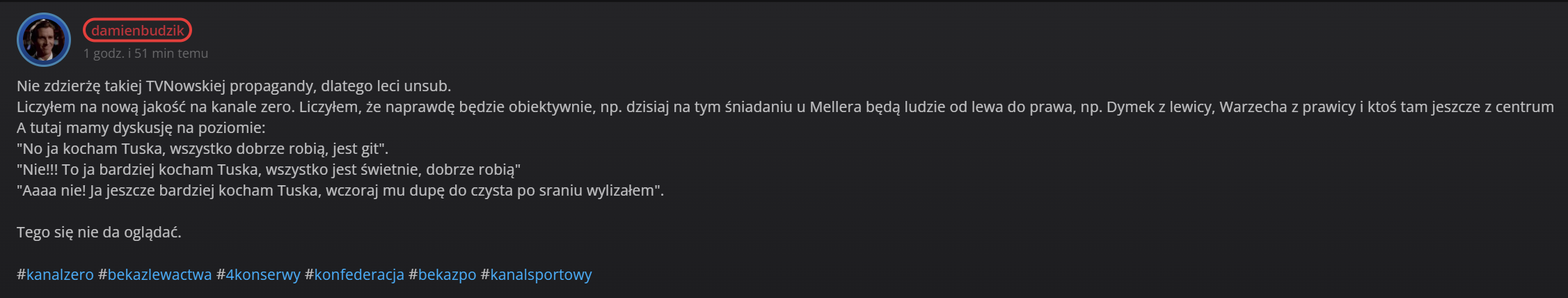 @grand_khavatari @Chris_Karczynski można, tylko ton tych wypowiedzi wygląda jakby konfiarzowi wreszcie puściły zwieracze, bo ma po długich oczekiwaniach dowód na swoje PiS = PO JEDNO ZŁO!!!!!! HEHE ZARAZ BĘDZIECIE MIEĆ DOŚĆ TUSKA! TYLKO KONFEDERACJA!