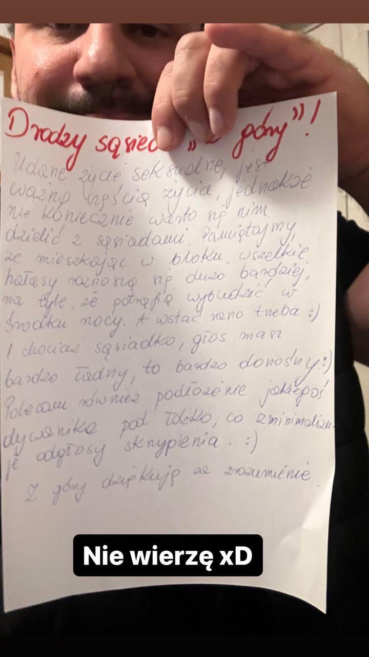 Taka w sumie śmieszna sytuacja - mieszkam we wspólnocie 2 małe bloki po 12 mieszkań. I od dawna jest tam anonimowy szeryf, co lubi przyklejać swoje wypracowania A4 na klatce. A to, ze za głośno ktoś się rucha, a to że widział peta lecącego przez okno, a to że kogoś pies szczeka - wrzucałem tu te karteczki na wykop (no jedna dodaje). Realnie nic z tych opowieści dziwnej treści nie ma miejsca