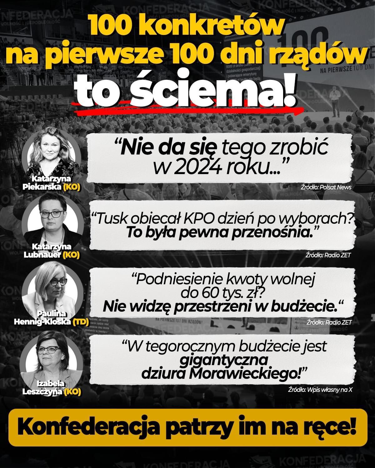 Naobiecywali ludziom utrzymanie PiS-owskiego rozdawnictwa, dołożenie swojego (jak babciowe, czy kredyt 0%), a do tego zapewniali, że przy tym obniżą podatki. Teraz okłamują wyborców i wykręcają się z kolejnych obietnic, bo "nie ma pieniędzy", a przecież WSZYSCY wiedzieli, że stan finansów państwa jest bardzo zły!