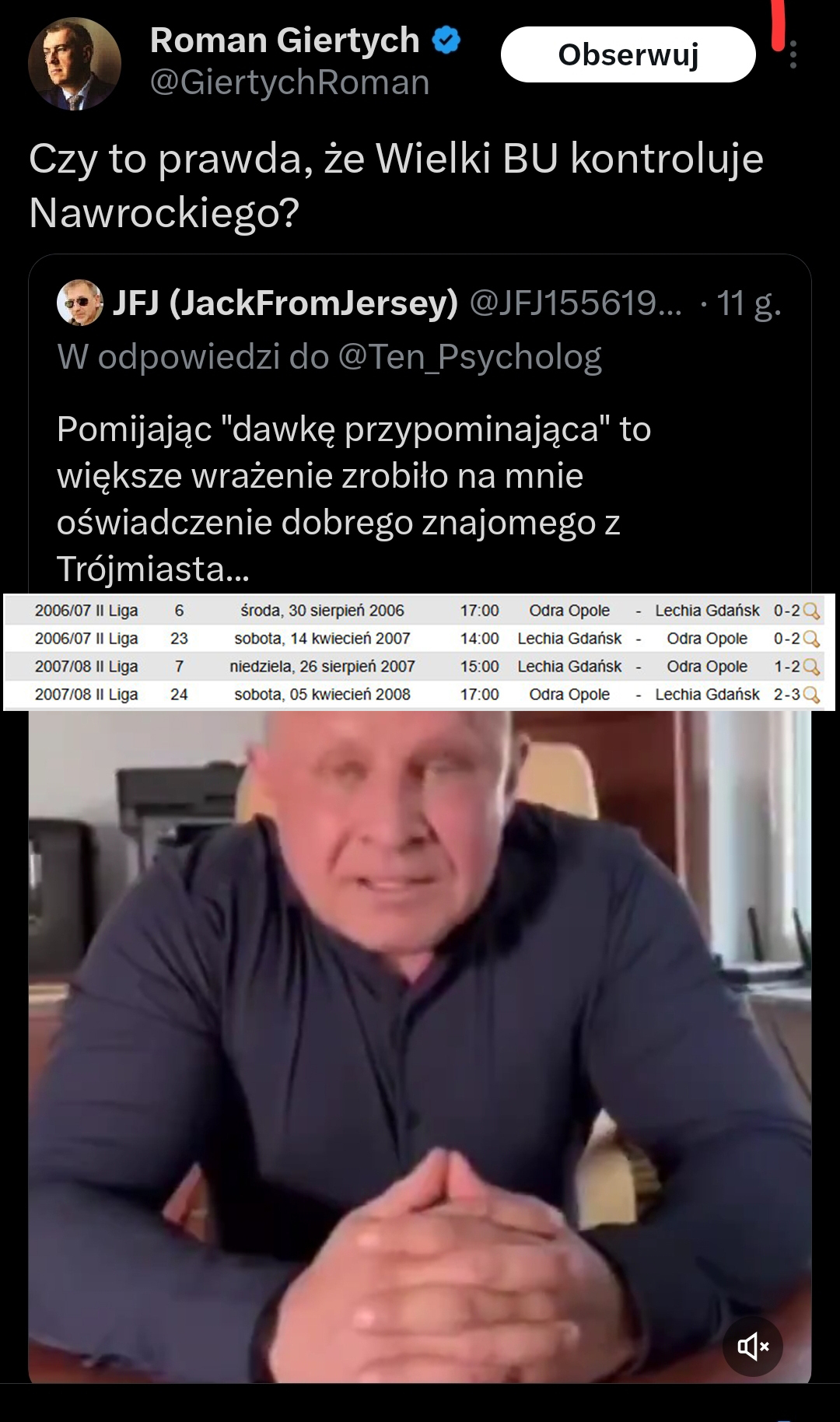 Giertych to faktycznie debil, nawet nie zweryfikował czy taki mecz się odbył. Sprawdziłem, nie było w 2007 roku żadnego meczu wyjazdowego z Odrą Opole. Były dwa mecze domowe a wyjazdowe był w 2006 i 2008. #polityka