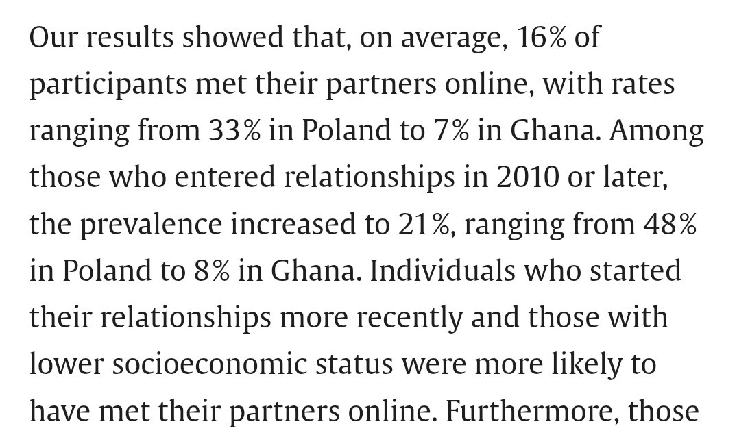 No właśnie, badania ankietowe mają to do siebie, że często dają mocno różne wyniki. Tutaj https://www.sciencedirect.com/science/article/pii/S0736585325000711 na przykład wyszło u Polaków, że 33% poznało się online, a jeżeli chodzi o związki, które powstały w 2010 i później, to nawet 48%.