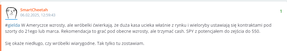 #gielda W Ameryczce wzrosty, ale wróbelki ćwierkają, że duża kasa ucieka właśnie z rynku i wieloryby ustawiają się kontraktami pod szorty do 21ego lub marca. Rekomendacja to grać pod obecne wzrosty, ale trzymać cash. SPY z potencjałem do zejścia do 550.