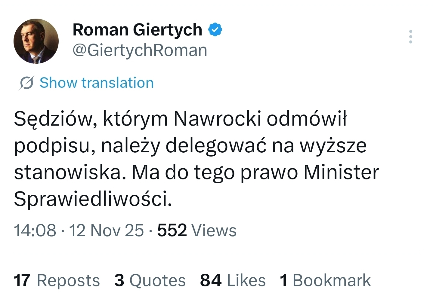 Nie będę dawał nominacji, awansów tym sędziom, którzy kwestionują porządek konstytucyjno-prawny Rzeczpospolitej; tym sędziom, którzy słuchają złych podszeptów ministra sprawiedliwości.