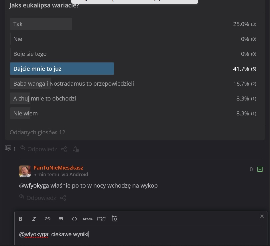 @Horrorystyczny_Demon_Pagona: czemu szkoda, pewnie dobrze się bawi oglądając, niektórym lepiej się żyje jak są w pewnym ,,obozie,, i mogą poszkalować drugi. Czy to chodzi o politykę czy kluby piłkarskie czy inne tego typu. Natura