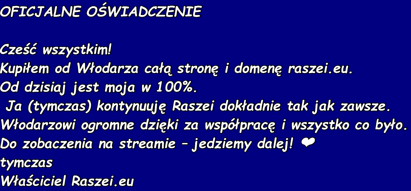 @PolskaC odpowiem na twoje pytania Vethy vel Włodarz z poprzednich sezonów Szkajpur był właścicielem strony raszei.eu oraz włodarzem tej produkcji, oczywiście jak zawsze zaangażowane w to było cwelowisko DC, i teraz mamy sytuacje, że jego piesek o nicku Tymczas, wafel z realu (to samo ip) regbaituje jakoby odkupił raszei, swoją drogą i dobrze, będzie na kogo wskazać palcem jak korkarz się wykręci, do spółki dołączył nijaki PuszkaMonstera, jest to nowociota w