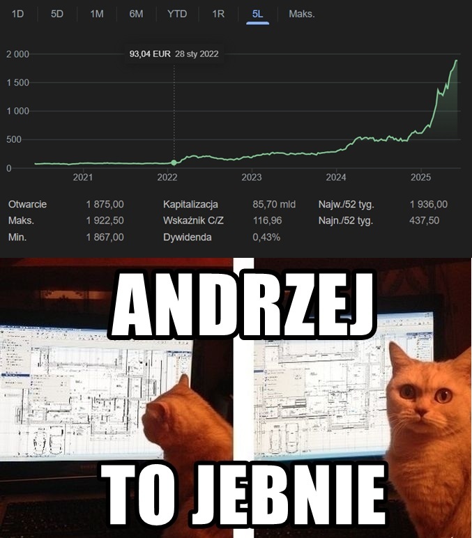 @Just_Jump: Tego Ci nie powiem, czas na kupowanie był w styczniu/lutym, kiedy USA mieszało na Ukrainie i stało się jasne, że Europa będzie płacić więcej na zbrojenia. To był świetny interes, bo tak na dobrą sprawę to w tej Europie mało co jeszcze jest i jakiekolwiek kontrakty trafią do tego co się jeszcze ostało.